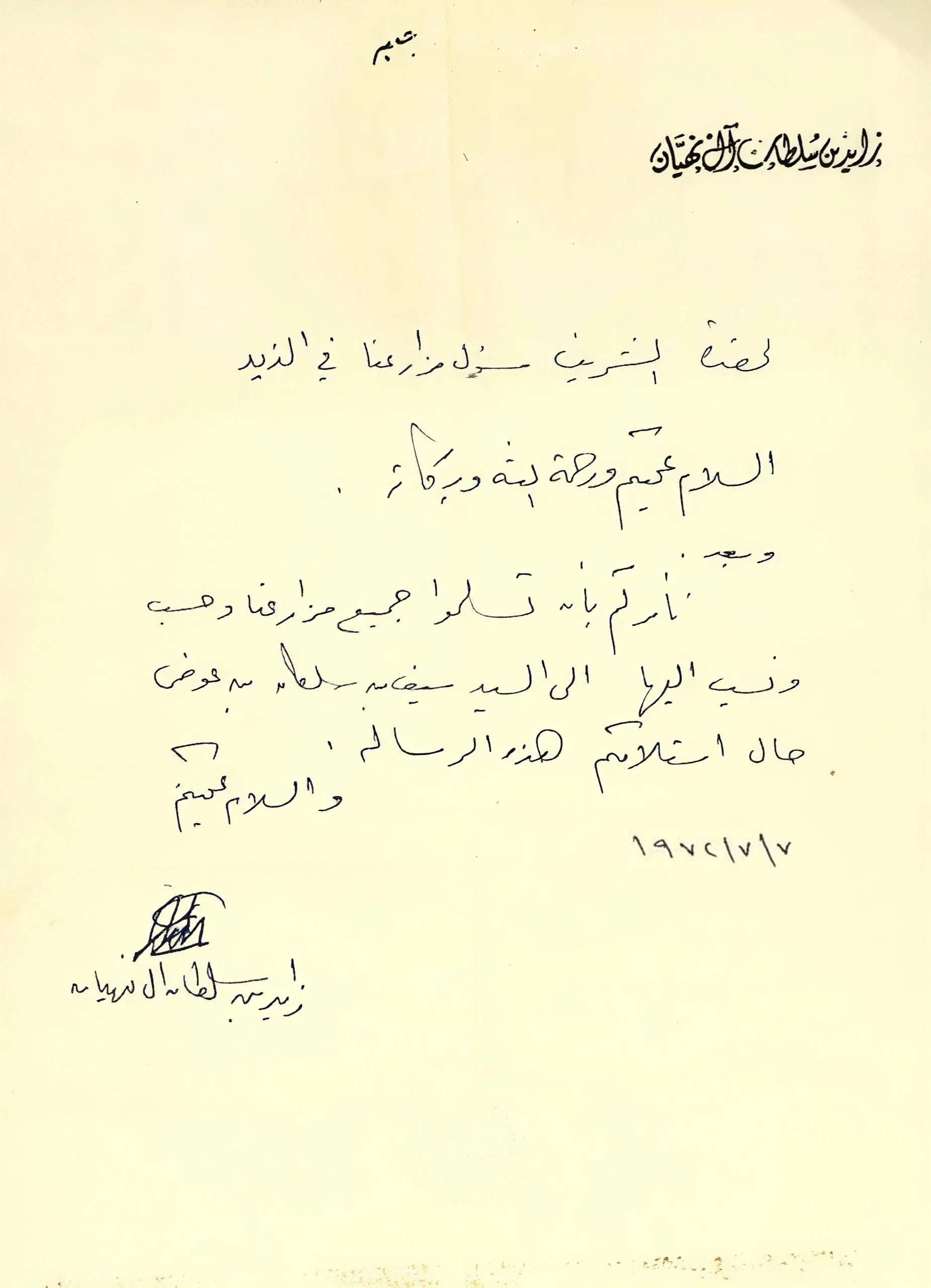 وثيقة مؤرّخة 7-7-1972 بخط اليد مروّسة باسم الشيخ زايد، تُشير إلى متابعةٍ مباشرة لشؤون المزرعة، وتُعد شاهداً أصيلاً على العناية بالمكان.