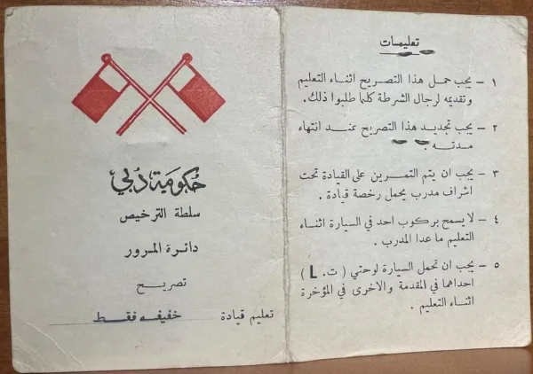 تصريح تعليم قيادة حكومة دبي 1981م هو وثيقة تاريخية وأرشيفية قيمة تسجل جزءاً من تاريخ الأنظمة الحكومية والخدمات العامة في إمارة دبي