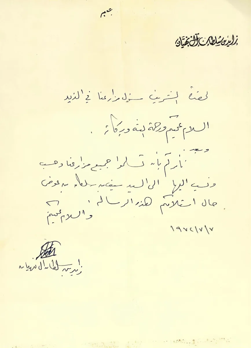 وثيقة مؤرّخة 7/7/1972 بخط اليد مروّسة باسم الشيخ زايد، تُشير إلى متابعةٍ مباشرة لشؤون المزرعة، وتُعد شاهداً أصيلاً على العناية بالمكان.