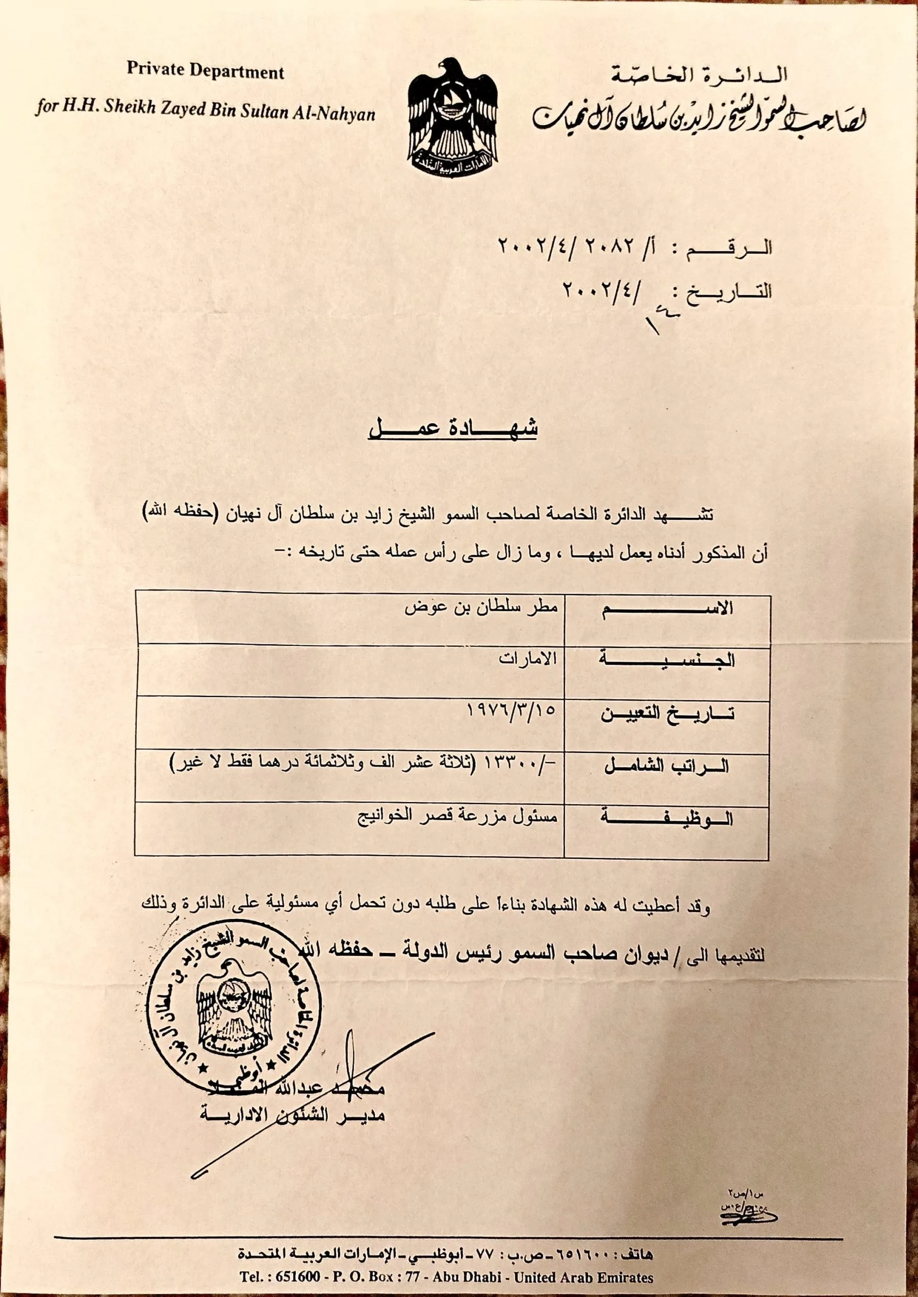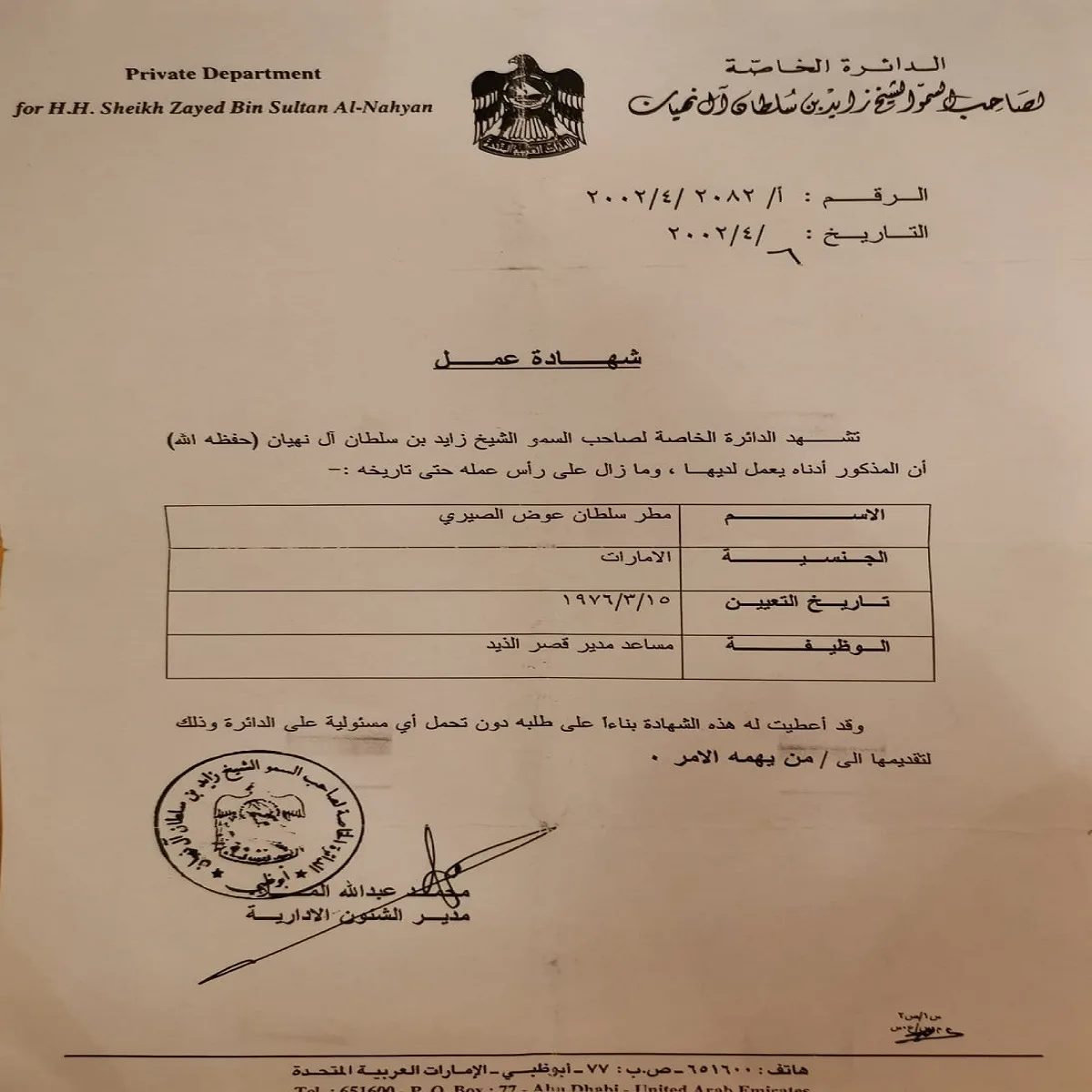 منصب: مساعد مدير قصر الذيد وقصر الخوانيج في الدائرة الخاصة لصاحب السمو الشيخ زايد بن سلطان آل نهيان
